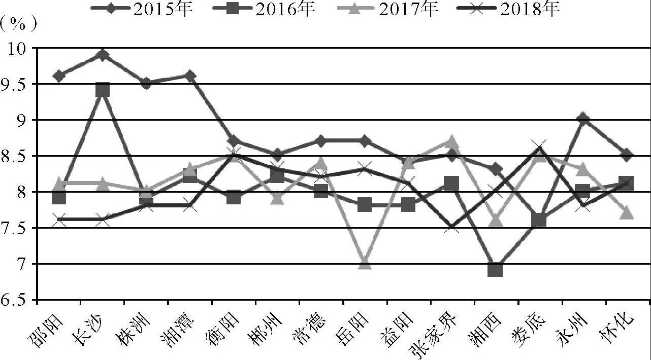 图 1-2 湖南省各市(州)地区生产总值增长速度(2015—2018 年)
