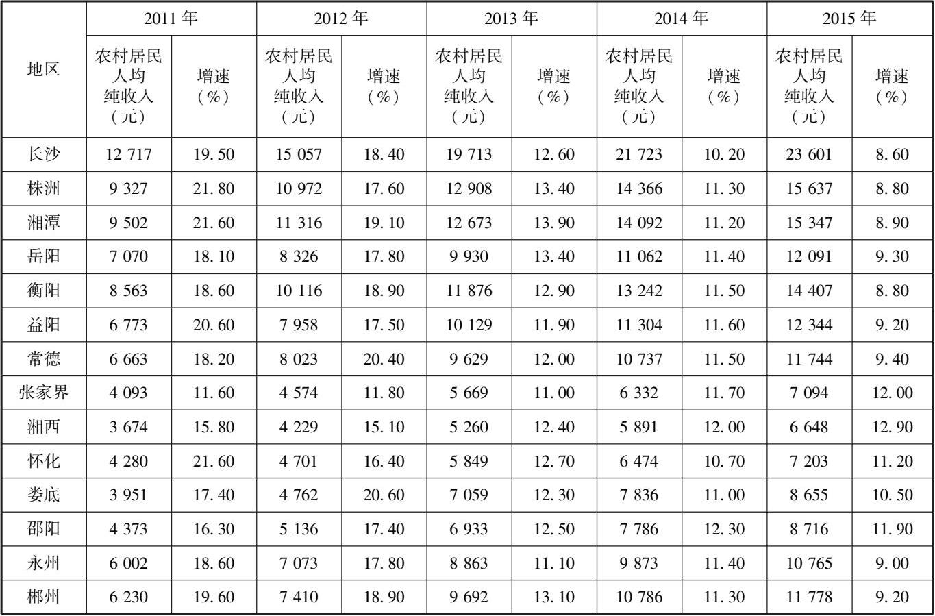 表 1-5 邵阳农村居民可支配收入与其他地区的比较(2011—2015 年)
