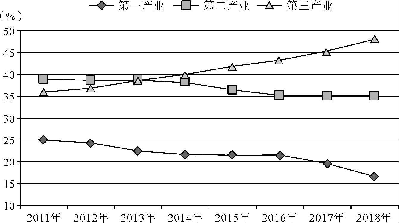 图 1-4 邵阳三次产业结构变化(2011—2018)