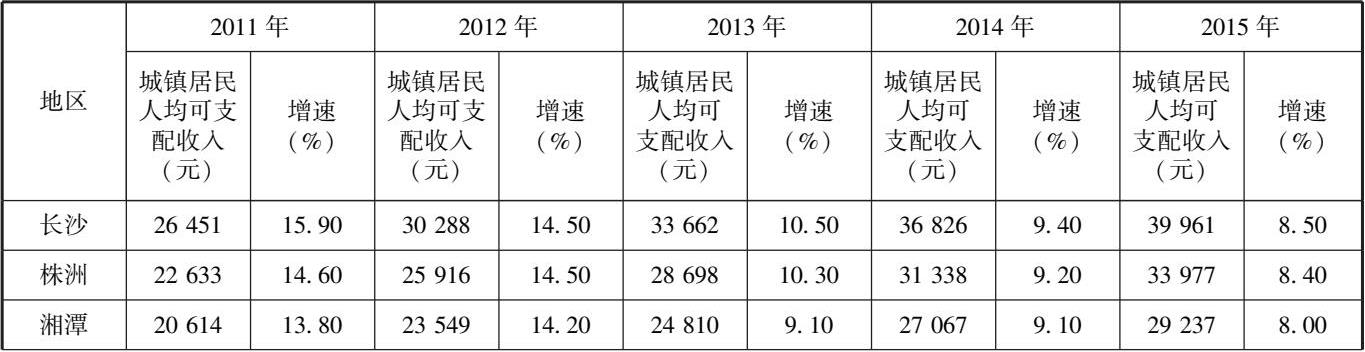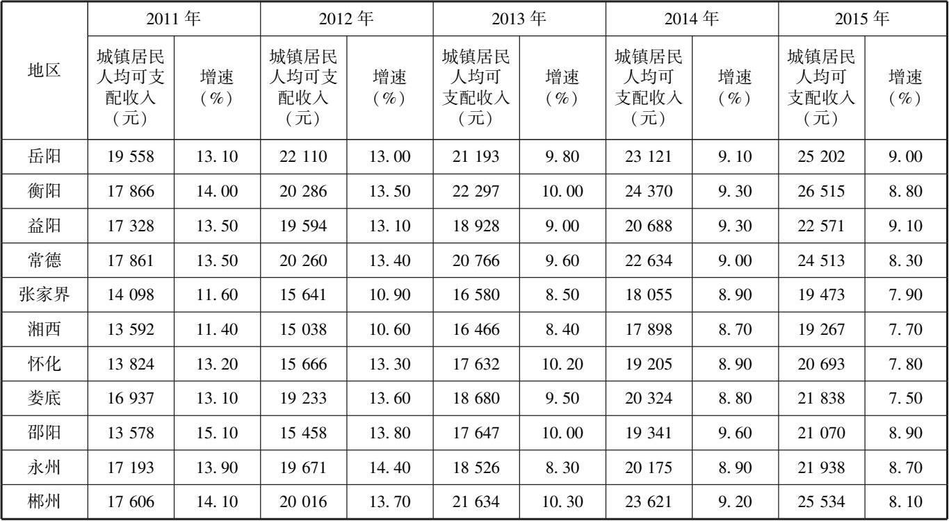 2018 年,邵阳城乡居民人均可支配收入为 18010 元,居湖南第 11 位,城乡居民可支配收入较上年增长 10.1%,增速高于湖南平均水平。其中,城镇居民人均可支配收入为 27167 元,同比增长 8.5%;农村居民人均可支配收入为11 857 元,同比增长 10. 2%,农村居民人均收入增速较快。表 1-3、表 1-4 和表 1-5 分别是 2017 年和 2011—2015 年邵阳城乡居民可支配收入与其他地区的比较