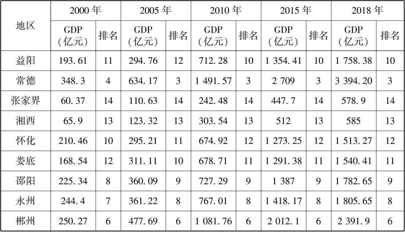 邵阳地处湖南西南部,近年来,邵阳经济稳步增长,社会事业全面进步,民生状况不断改善。2018 年,邵阳地区生产总值(GDP,下同)为 1 782. 65亿元,在湖南省 14 个市(州)中排名第 9 位(见表 1-1)。截至 2018 年年底,邵阳的年产值过亿元的企业数量达 566 家,其中年产值达 50 亿元的企业 1 家,年产值达 20 亿元的企业共 7 家,年产值超过 10 亿元的企业共 20 家,年产值超过 5 亿元的企业共 73 家