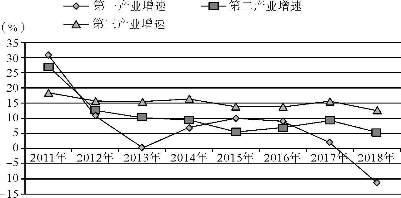 随着邵阳经济的不断发展,三次产业的总产值都持续增加,三次产业结构也随社会需求变化不断调整,随经济发展的要求不断优化。从近年来的增长速度看,邵阳第三产业的增长速度较平稳,且快于第一产业的增长速度,第二产业的增长速度整体呈下降趋势。2015 年,邵阳第一产业增长速度为 10.18%,第二产业增长速度为 5.54%,第三产业增长速度为 13.97%;2016 年,邵阳三次产业增长速度分别为 9. 16%、7. 02%、13. 82%;2017 年,邵阳三次产业增长速度分别为 2. 04%、9. 45%、15. 64%。到 2018 年,邵阳第一产业首次出现负增长,增长速度为-11.29%,第二产业和第三产业增长速度分别为 5.33%和12. 73%。邵阳产业结构逐年优化(见表 1-6、图 1-7 和图 1-8)。