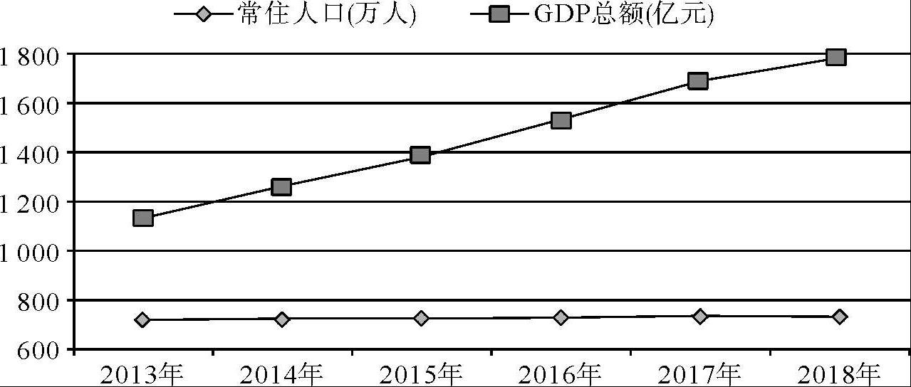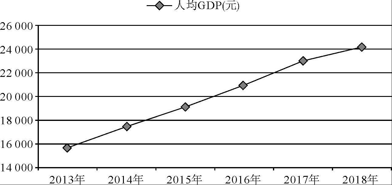 从近年来的人口数量变化看,邵阳人口总量平稳增长,增速缓慢,2013—2018 年,常住人口总数从 720 万人增长到 737 万人,年均增长 0.467%。2013 年,邵阳地区生产总值为 1 130. 04 亿元,2018 年为 1 782. 65 亿元,年均增长 9. 54%。地区生产总值的增长速度快于人口增长速度,因此邵阳市人均GDP逐年增加(见图 1-5 和图 1-6)。