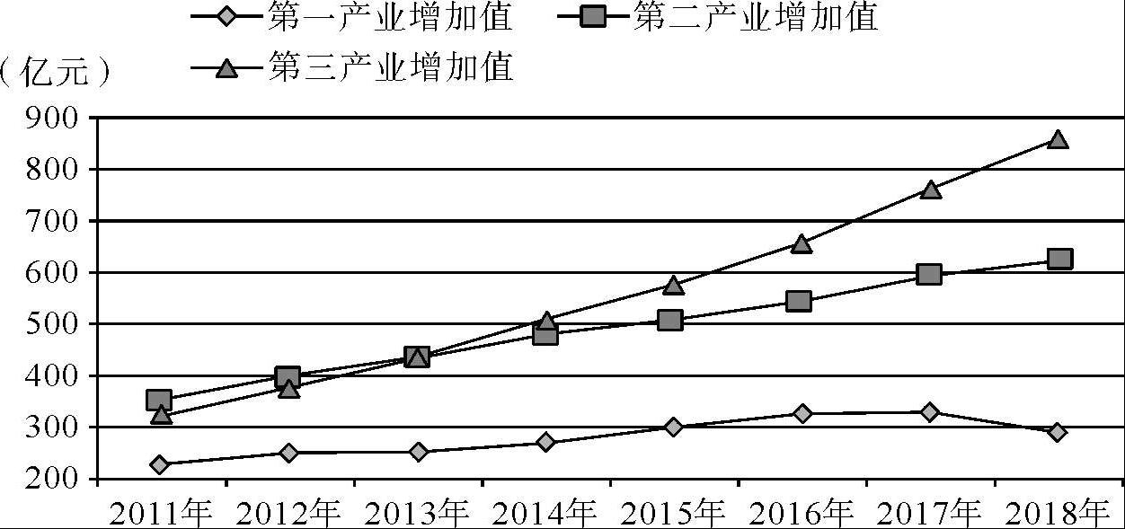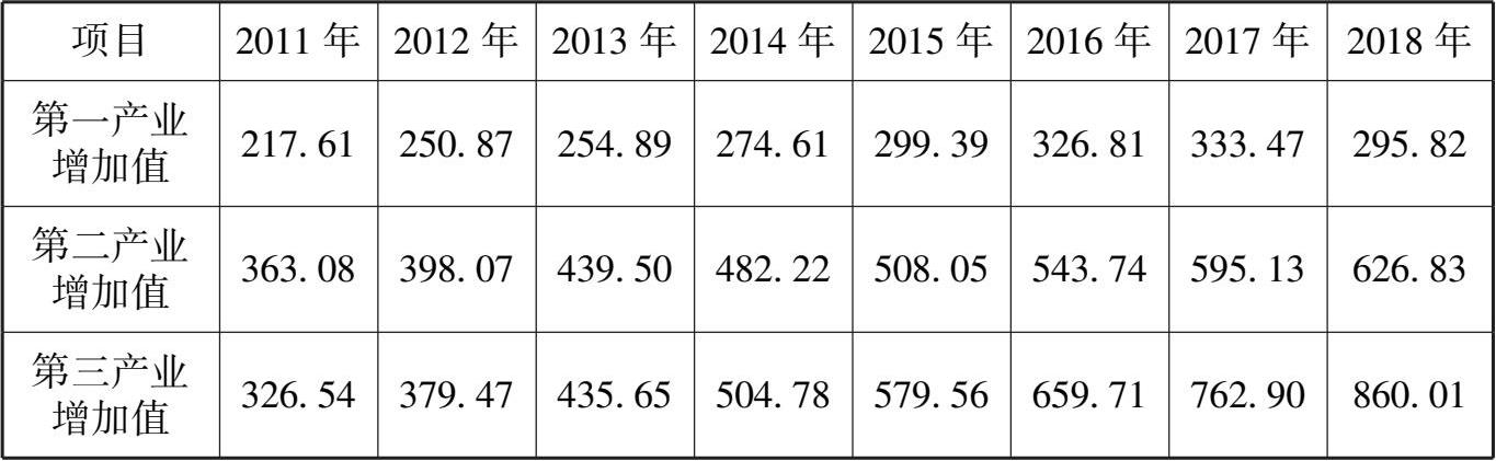 从表 1-5、图 1-7 可以看出,邵阳第三产业增加值在 2014 年超过第二产业增加值,并且邵阳第二产业和第三产业增长速度明显快于第一产业。