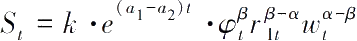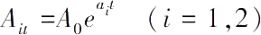 同时引入时间t,在经济动态发展的视角上解释金融抑制对经济体在长期发展过程中所产生的影响。根据摩尔定律,本文假设技术以指数型进步。设两部门的技术进步率分别为a 1 和a 2 ,则生产技术的动态形式为