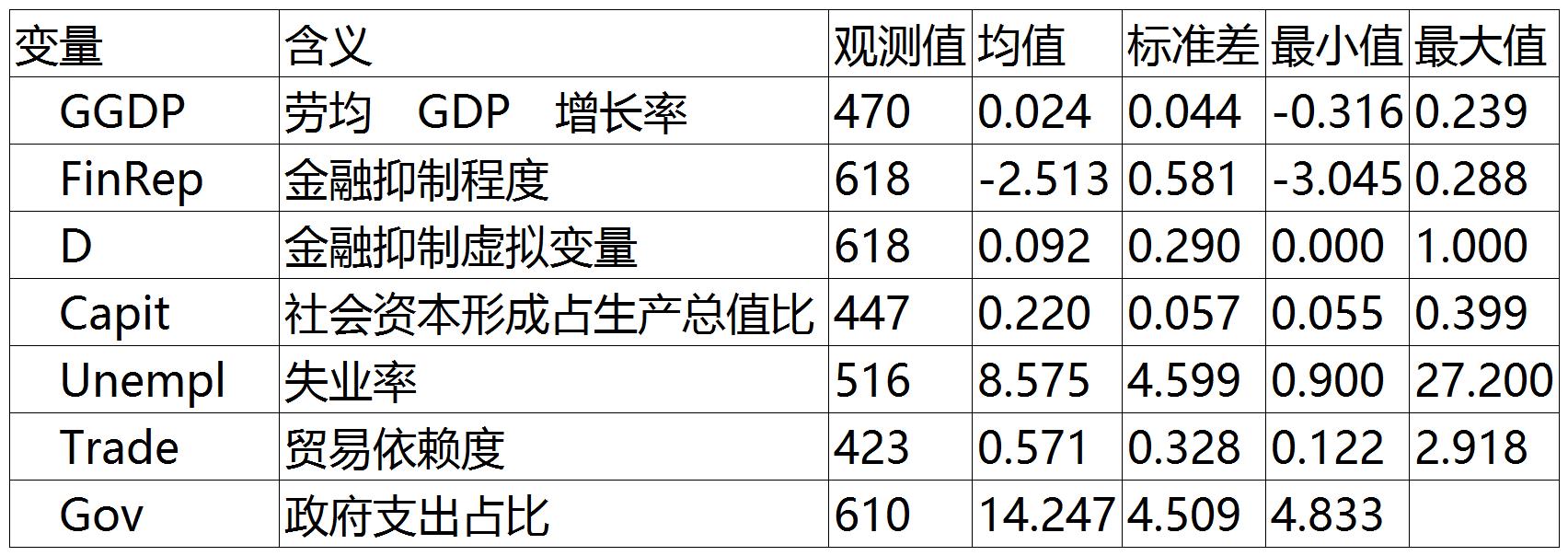 本文参考Huang and Wang(2011)在研究中国金融抑制对经济增长双重作用时选取的控制变量:加入资本形成占比(Capit)解释资本投入对经济增长的作用;加入失业率(Unempl)吸收经济短期波动的影响;加入进出口总额占GDP比(Trade)表示一国的贸易开放度;加入政府公共支出占GDP比例(Gov)解释政府财政支出对经济的影响。