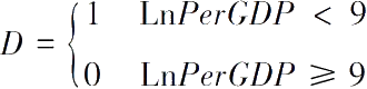 由(27)式和(28)式计算可得,世界各国产业结构变化的转折点为对数劳均GDP等于9.45时,发展中国家的转折点为该值等于8.42时。因此,本文取对数劳均GDP等于9作为产业结构转型的近似分界点,并以此设置虚拟变量D:
