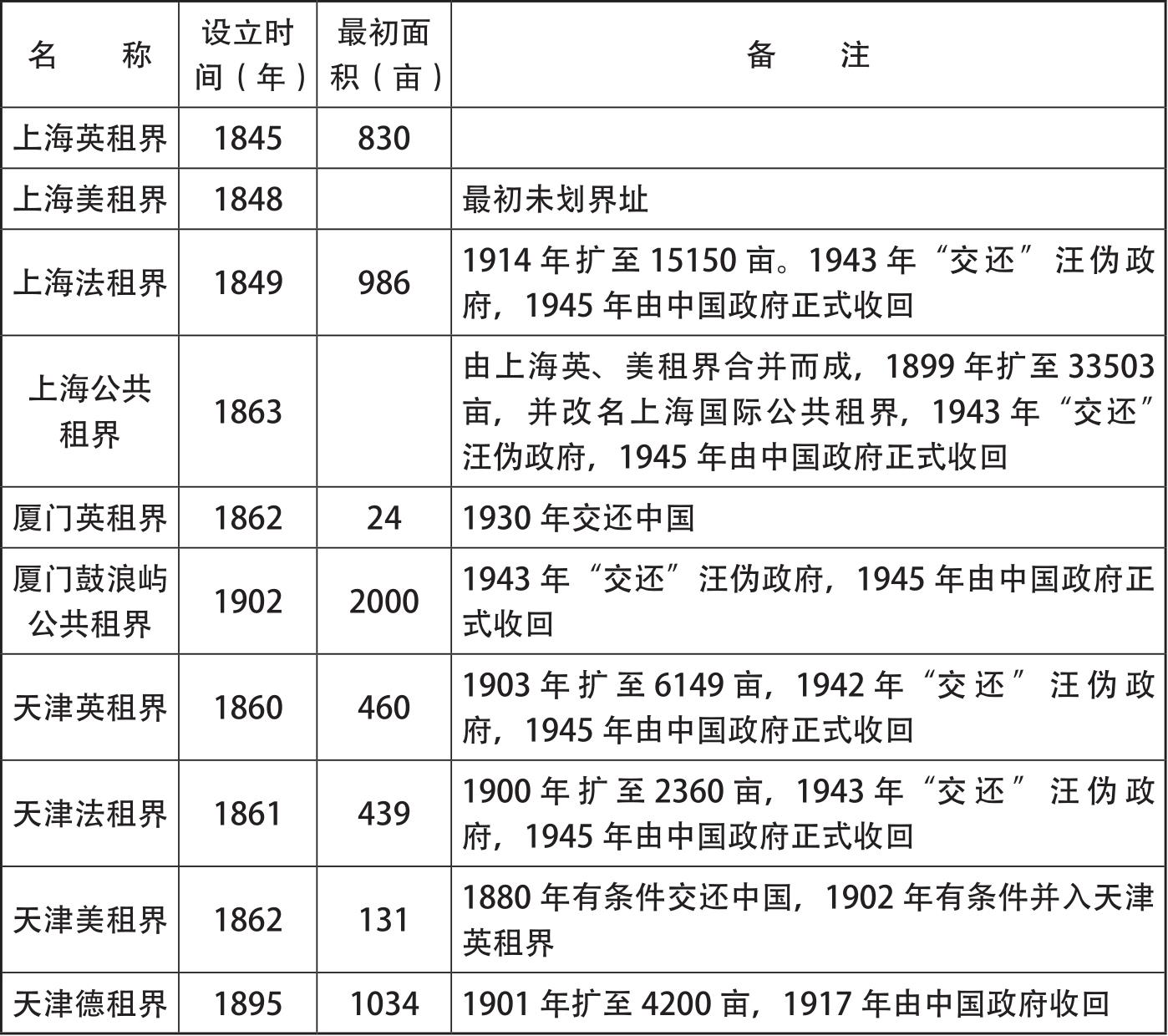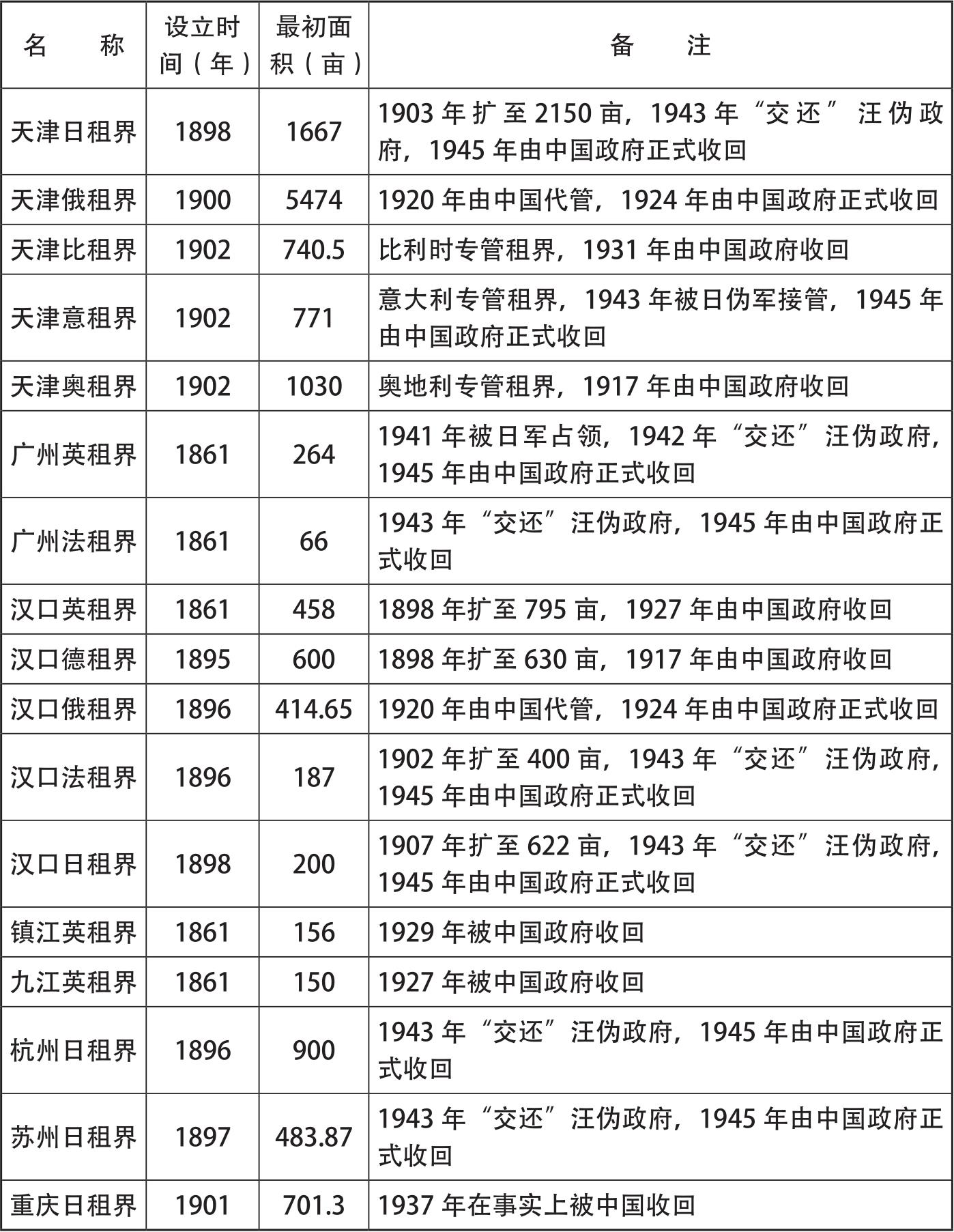 资料来源:费成康:《中国租界史》,上海社会科学院出版社1991年版,第427—430页;《各国租界、租借地、铁路附属地、约开商埠一览表》,载《列强在中国的租界》编辑委员会编:《列强在中国的租界》,中国文史出版社1992年版,第590页。