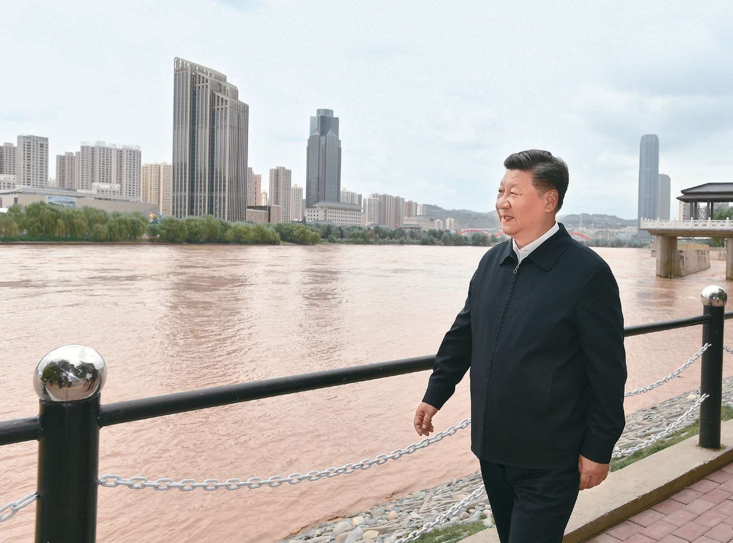 2019 年 8 月 21 日,习近平在甘肃兰州市黄河治理兰铁泵站项目点了解黄河治理和保护、堤坝加固防洪工程建设等情况。