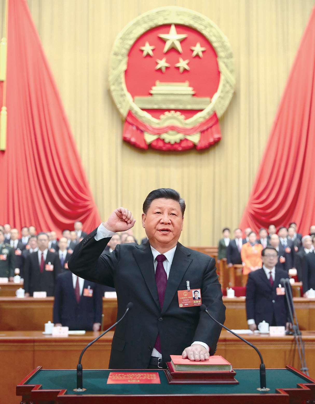 2018 年 3 月 17 日,习近平在第十三届全国人民代表大会第一次会议上当选中华人民共和国主席、中华人民共和国中央军事委员会主席。这是习近平进行宪法宣誓。