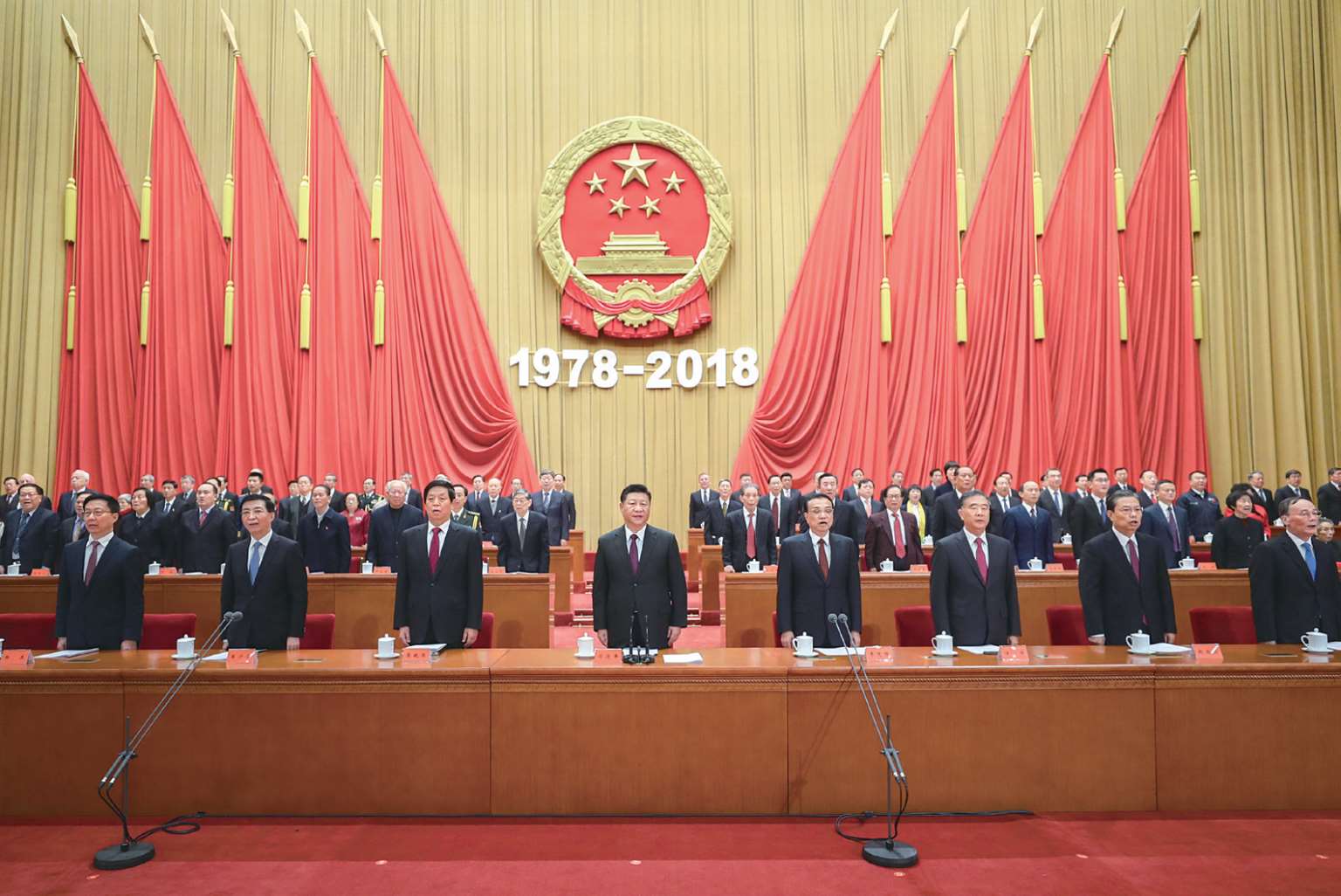 2018 年 12 月 18 日,庆祝改革开放 40 周年大会在北京人民大会堂举行。这是习近平同李克强、栗战书、汪洋、王沪宁、赵乐际、韩正、王岐山等出席大会。