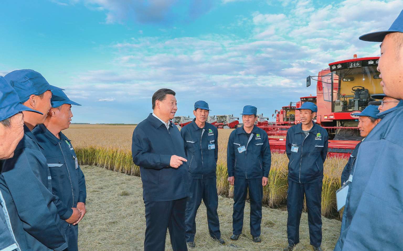 2018 年 9 月 25 日至 28 日,习近平在东北三省考察并主持召开深入推进东北振兴座谈会。这是 25 日,习近平在黑龙江农垦建三江管理局七星农场万亩大地号与农场工人交谈。
