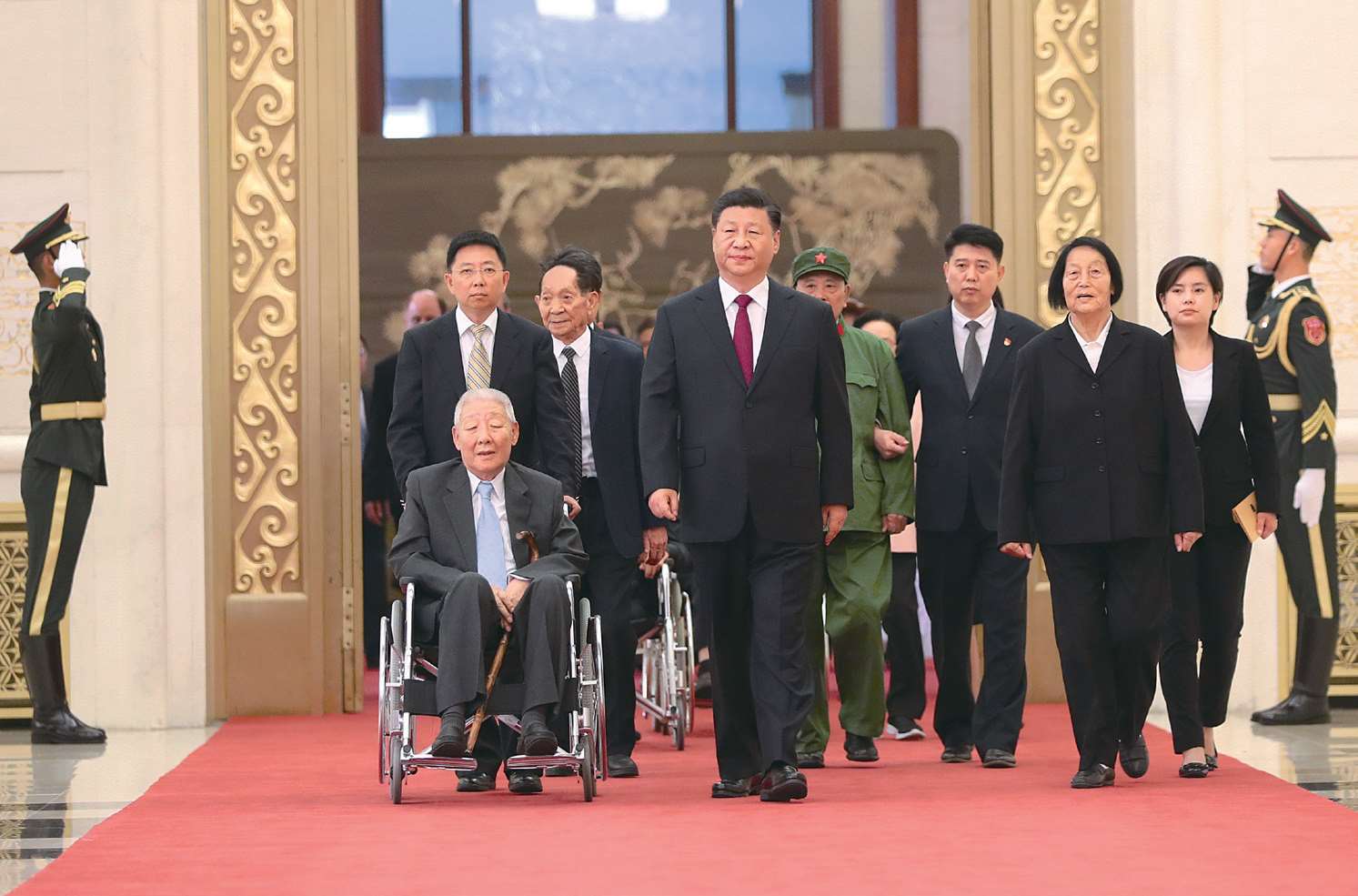 2019 年 9 月 29 日,中华人民共和国国家勋章和国家荣誉称号颁授仪式在北京人民大会堂举行。这是习近平同国家勋章和国家荣誉称号获得者一同步入会场。