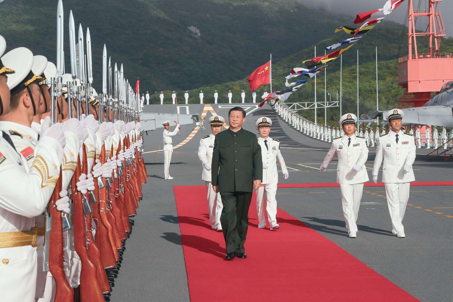 2019 年 12 月 17 日,中国第一艘国产航空母舰山东舰在海南三亚某军港交付海军。习近平出席交接入列仪式并登舰视察。这是仪式结束后,习近平登上山东舰,检阅仪仗队。