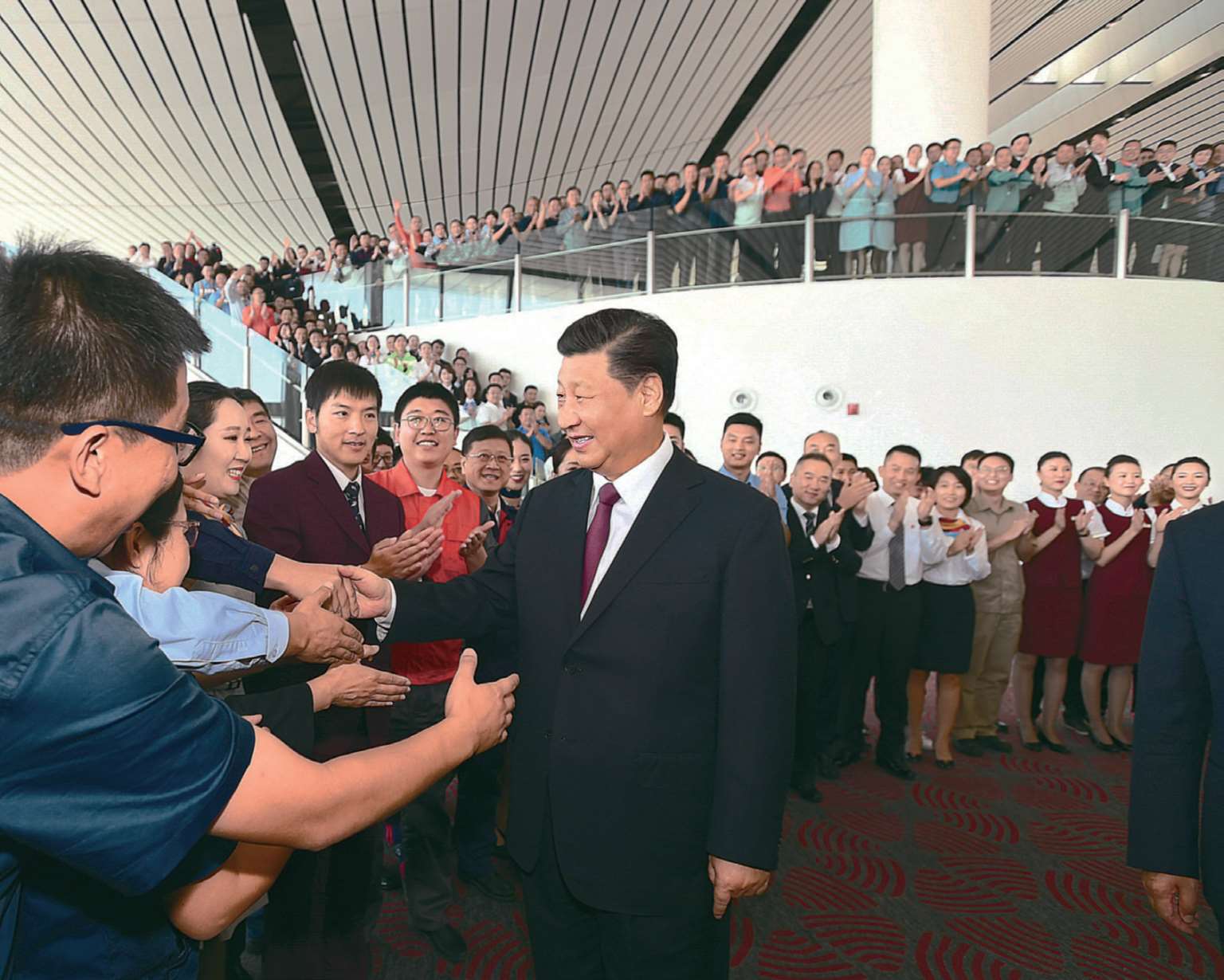 2019 年 9 月 25 日,习近平出席北京大兴国际机场投运仪式,宣布机场正式投运并巡览航站楼。这是习近平看望参与机场建设和运营的工作人员代表。