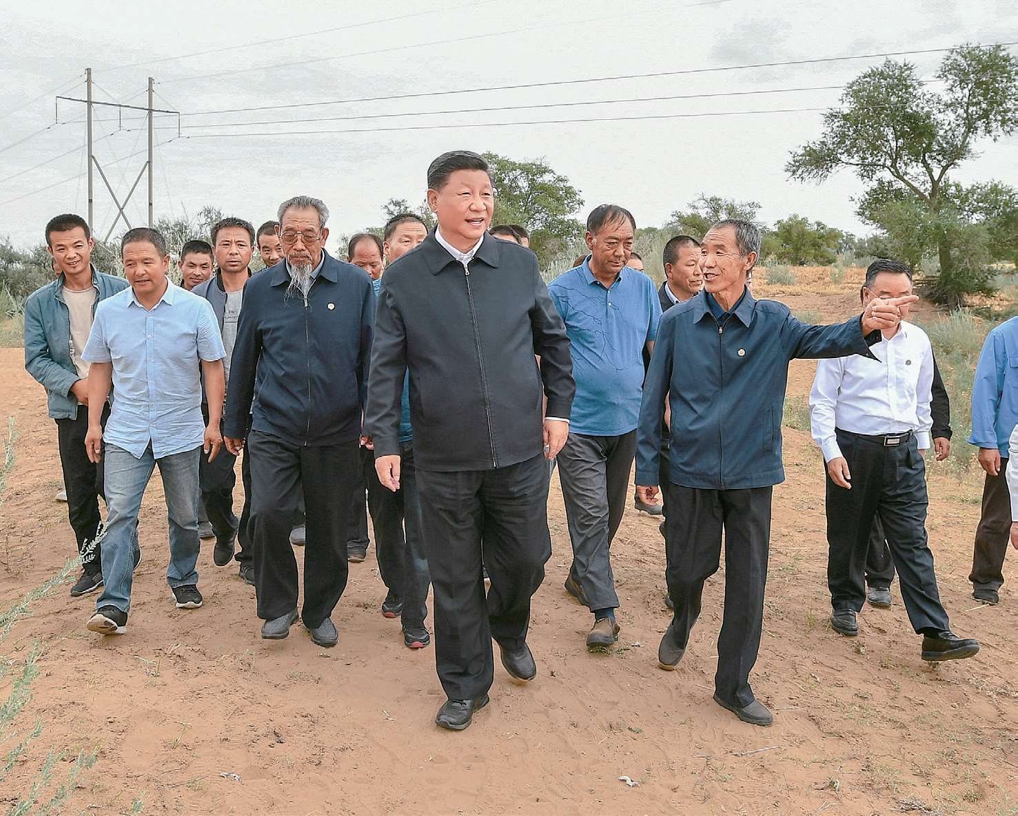 2019 年 8 月 21 日,习近平在甘肃武威市古浪县八步沙林场察看林场整体风貌,听取武威市防沙治沙整体情况汇报和八步沙林场“六老汉”三代人治沙造林事迹。