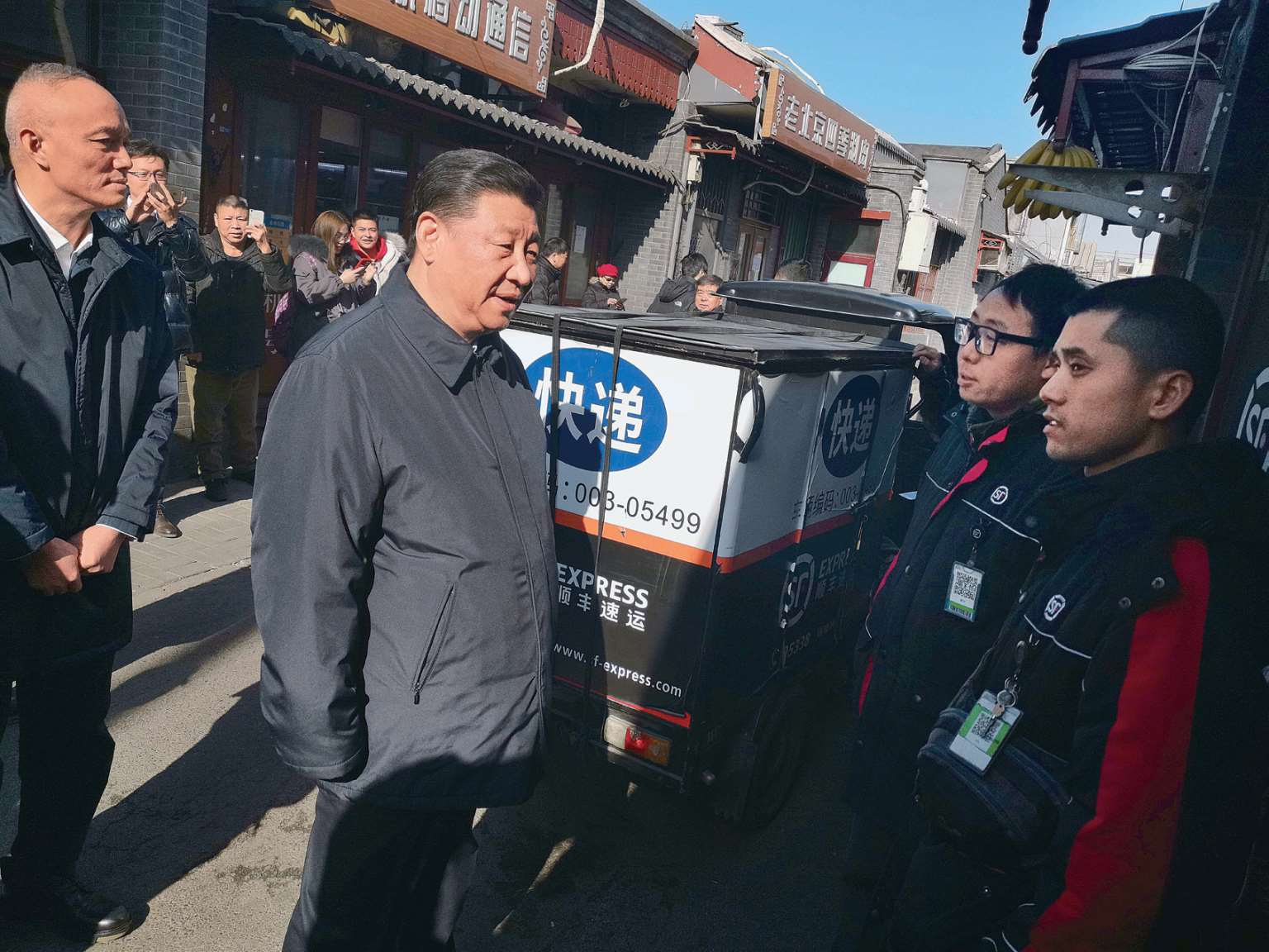 2019 年 2 月 1 日,习近平在北京慰问考察时,临时下车来到前门石头胡同的快递服务点,看望仍在工作的“快递小哥”,了解他们工作和生活情况,并祝他们春节快乐。