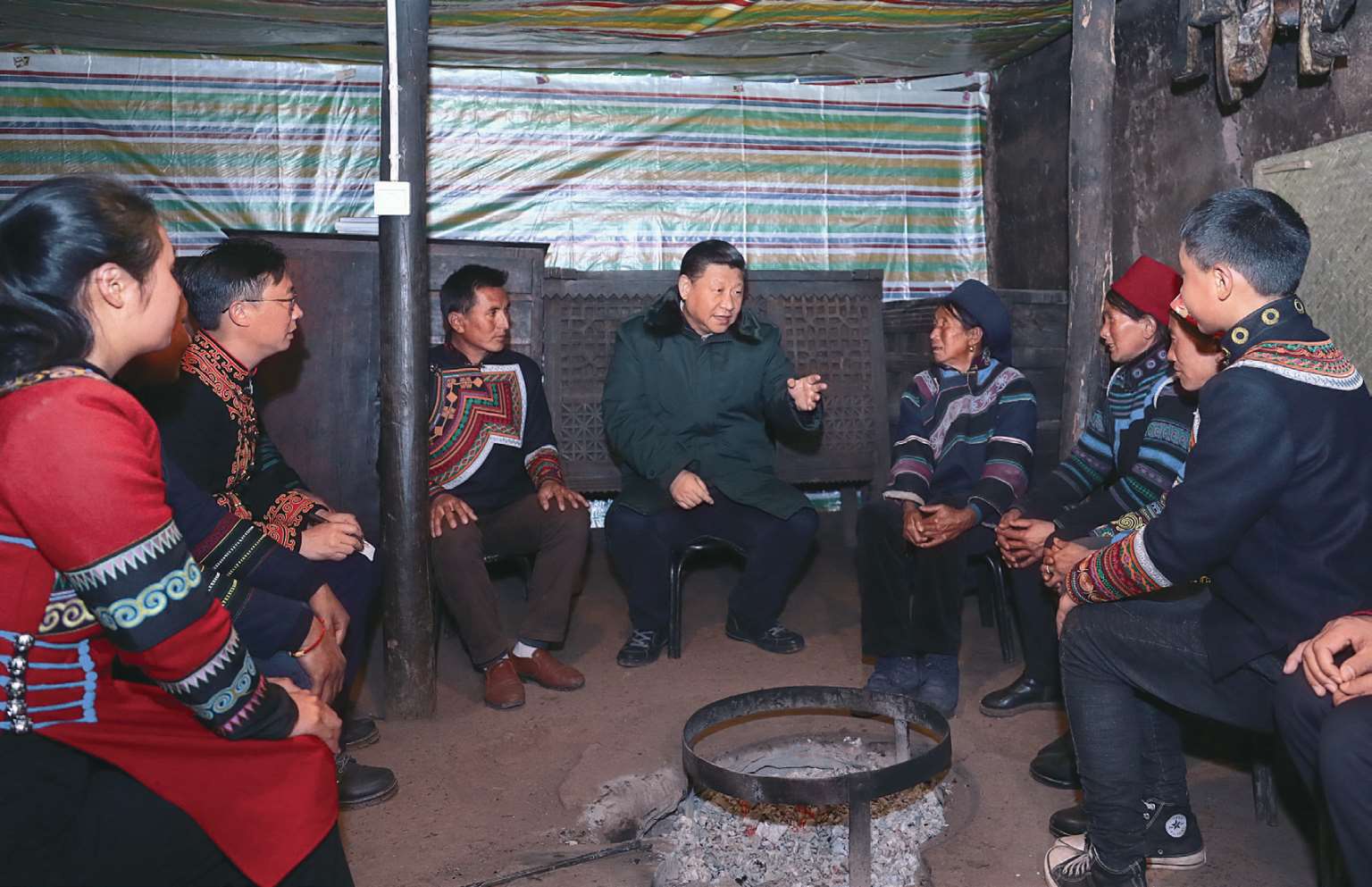 2018 年 2 月 12 日,习近平在四川成都市主持召开打好精准脱贫攻坚战座谈会。这是 11 日,习近平在凉山彝族自治州昭觉县三岔河乡三河村节列俄阿木家中,同村民代表、驻村扶贫工作队员围坐火塘边,共谋精准脱贫之策。