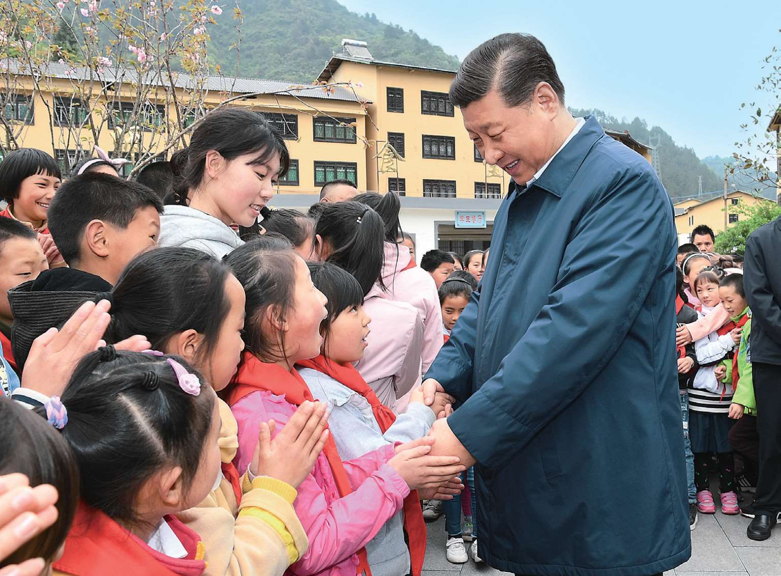 2019 年 4 月 15 日至 17 日,习近平在重庆考察并主持召开解决“两不愁三保障”突出问题座谈会。这是 15 日,习近平在石柱土家族自治县中益乡小学同学生们交谈。