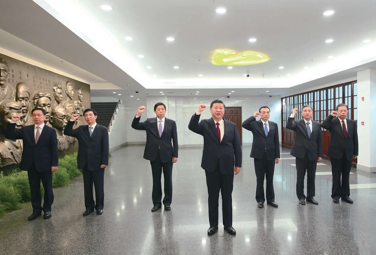 2017 年 10 月 31 日,习近平带领中共中央政治局常委李克强、栗战书、汪洋、王沪宁、赵乐际、韩正,在上海中共一大会址纪念馆重温入党誓词。