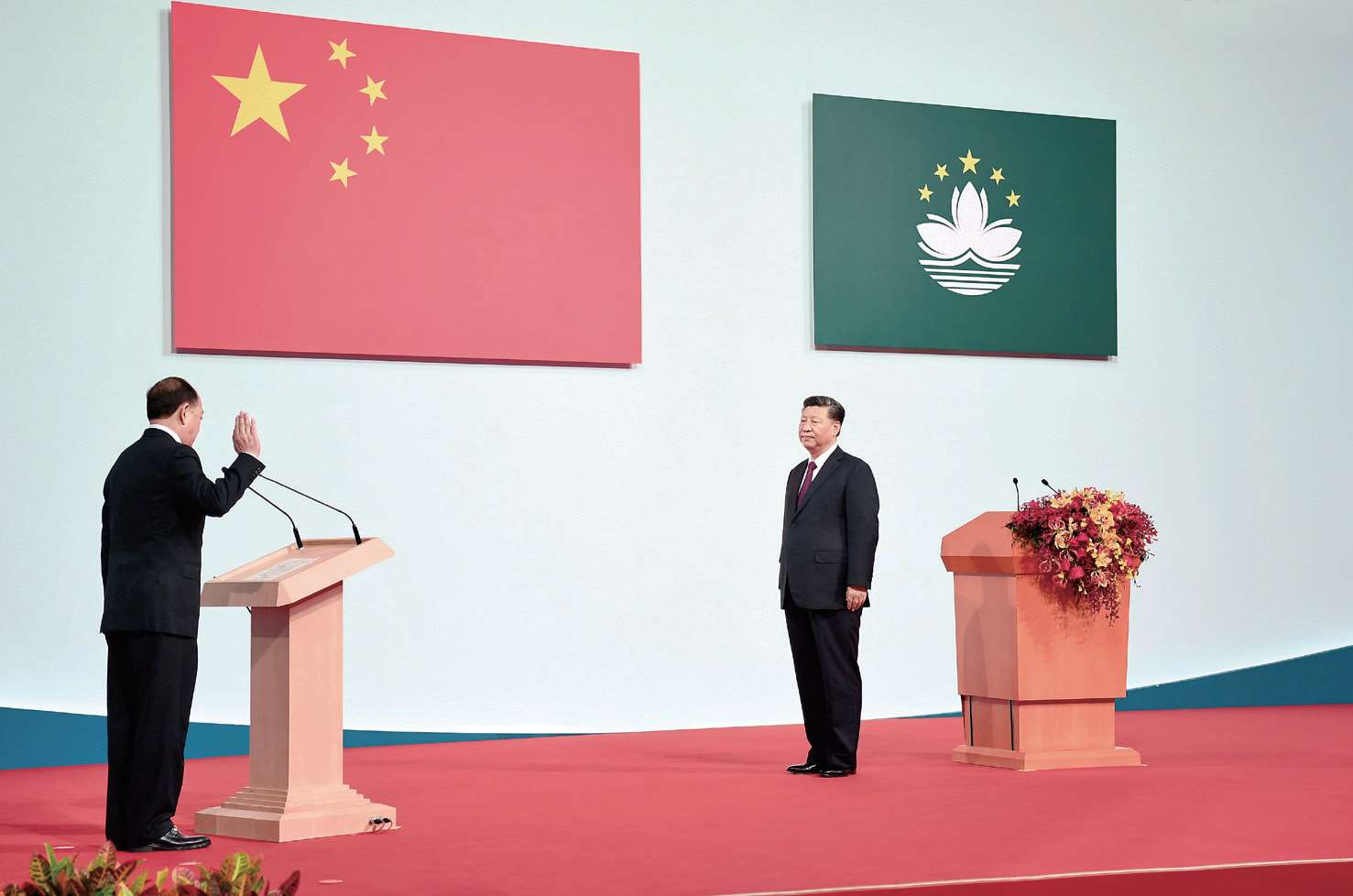 2019 年 12 月 20 日,庆祝澳门回归祖国 20 周年大会暨澳门特别行政区第五届政府就职典礼在澳门东亚运动会体育馆举行。习近平出席并发表讲话。这是习近平监誓,澳门特别行政区第五任行政长官贺一诚宣誓就职。