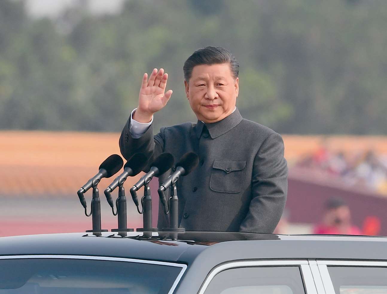 2019 年 10 月 1 日,庆祝中华人民共和国成立 70 周年大会在北京天安门广场举行。这是习近平检阅受阅部队。
