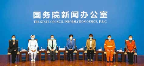 2020 年 3 月 8 日,国务院新闻办记者见面会现场,6 名疫情防控一线的巾帼奋斗者与记者见面交流