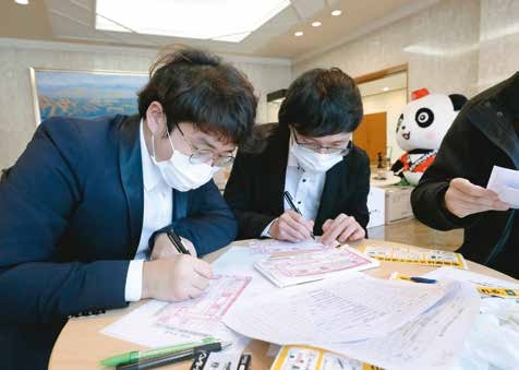 2020 年 4 月 17 日,中国驻日本大使馆向在日留学生发放“健康包”,图为留学生代表填写准备寄给各学校的“健康包”快递单