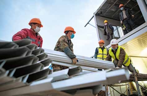 在项目临时党委的领导下,2020 年 2 月 2 日上午,武汉火神山医院正式交付。从方案设计到建成交付仅用 10 天。紧接着,雷神山医院交付使用,一座座方舱医院迅速开舱收治患者,开启生命摆渡。