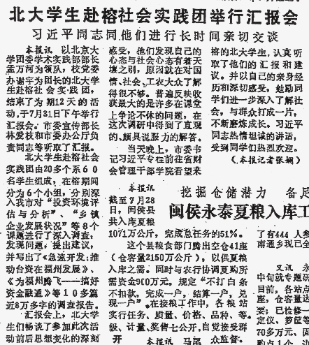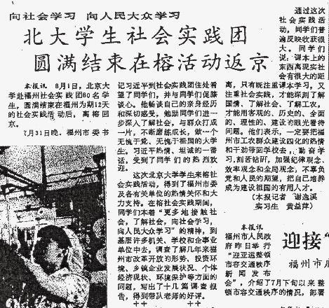 ※ 1990年8月3日,《福建日报》头版以《向社会学习 向人民大众学习——北大学生社会实践团圆满结束在榕活动返京》为题,报道习近平与北京大学赴福州社会实践团座谈交流。