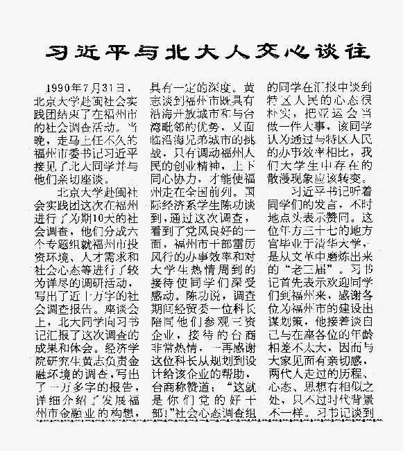 ※ 1991年5月10日,《福建大学生》刊发《习近平与北大人交心谈往》。