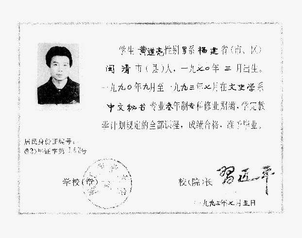 ※ 闽江职业大学1993届毕业生黄道亮的毕业证书(复印件)。