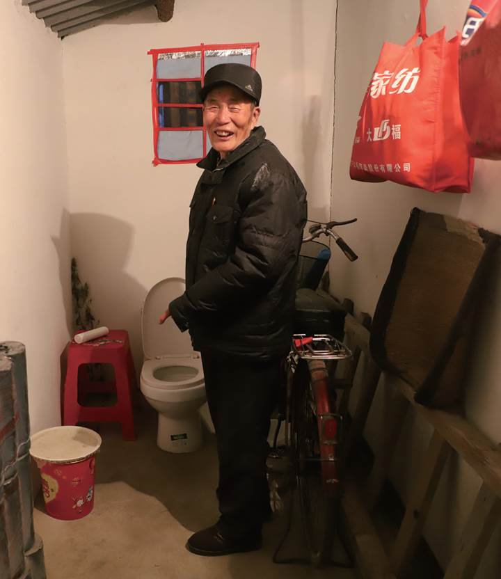 河南省信阳市邹庄村村民赵会阳展示政府户厕改造后家里的新厕所。