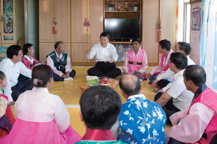 按照朝鲜族习俗,习近平总书记脱鞋走进屋里,察看主人的生活起居情况。随后,他盘腿而坐,同身着朝鲜族服饰的乡亲们拉起了家常。大家争着向总书记述说这些年村子里发生的可喜变化。