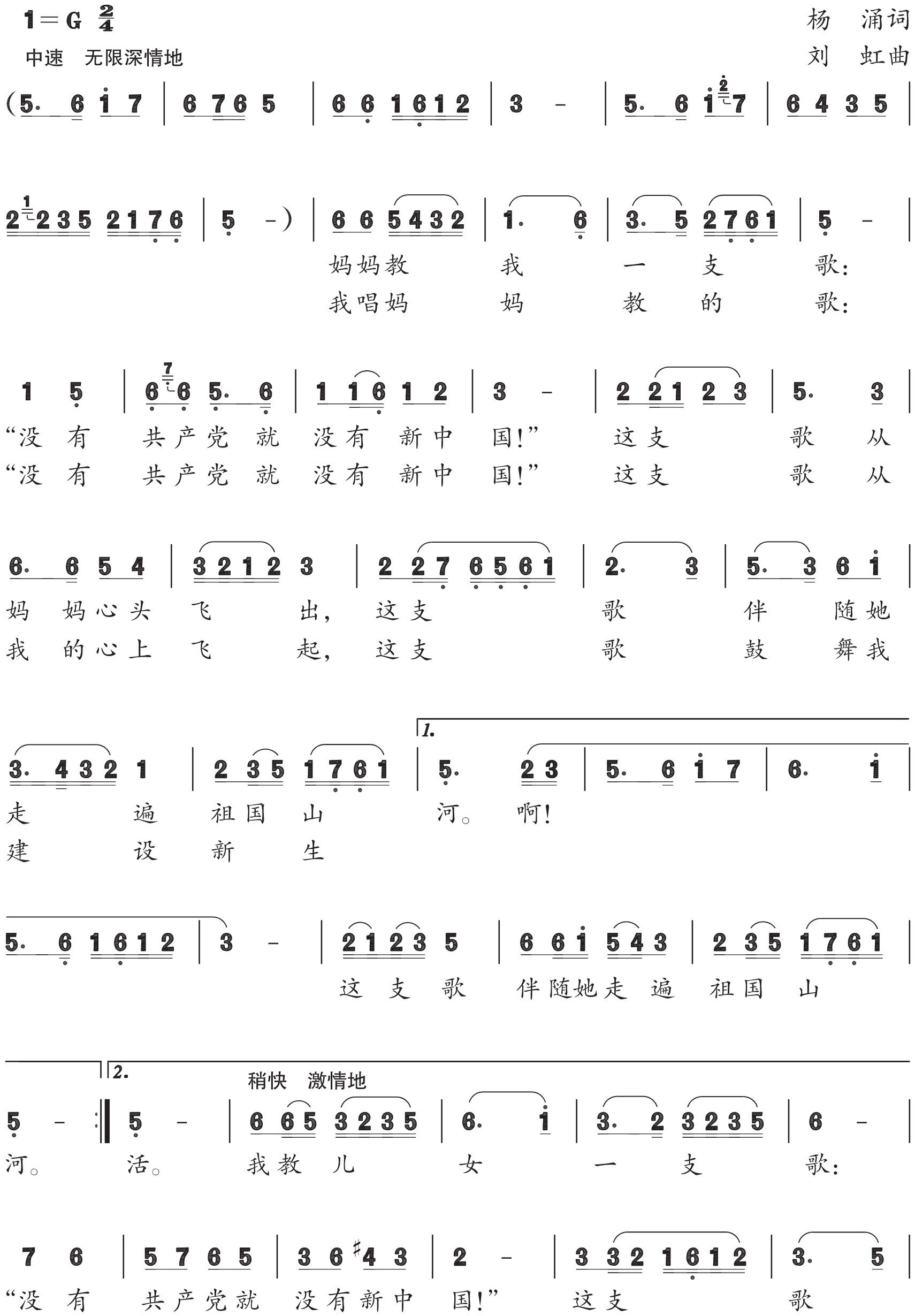 《妈妈教我一支歌》作于1981年。“一支歌”是人们熟知的历史歌曲《没有共产党就没有新中国》,词曲作者曾唱着这首歌参加了中国人民解放军。这首歌唱出了三代人对中国共产党的一往情深和不变的信任,音乐亲切感人,具有鲜明的民族特色和抒情风格。歌中自然和谐地再现了歌曲《没有共产党就没有新中国》的主题乐句,并与全曲融为一体,成功地表现了作品的主题。这首歌一经问世便引起了人们感情上的共鸣,很快在全国流传。