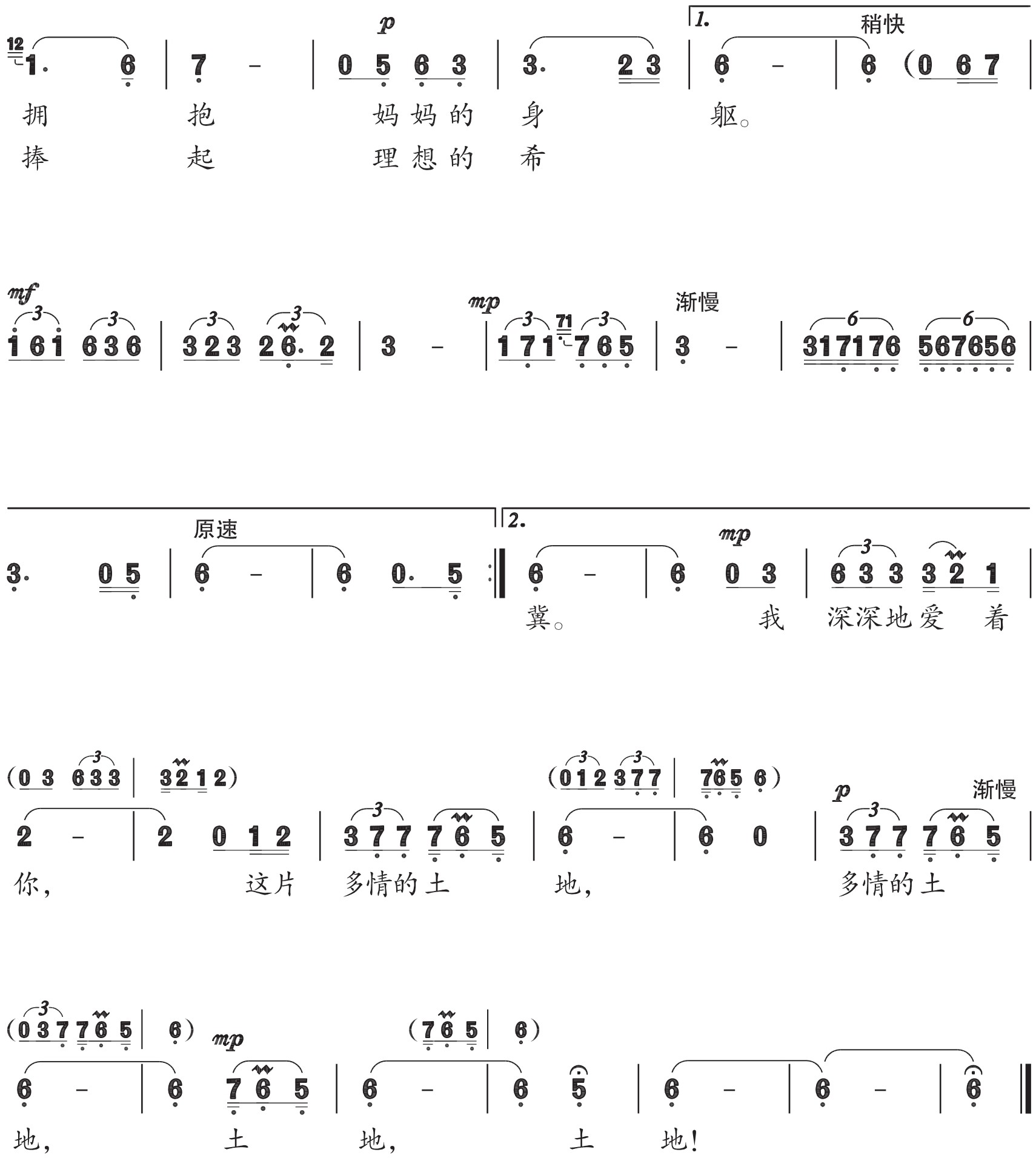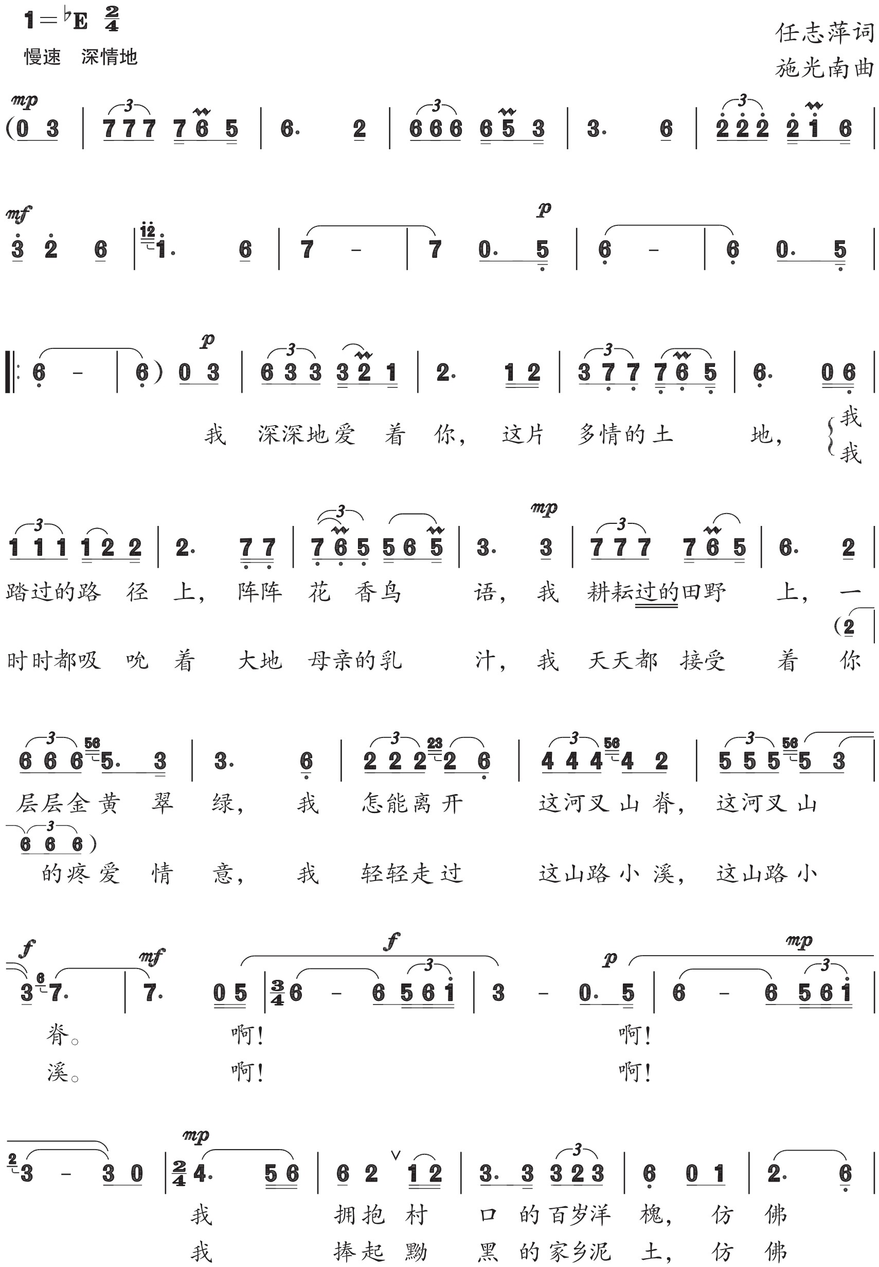 《多情的土地》作于1982年,首唱佟铁鑫。1982年中国正是处于百废待兴的时期,国内出现出国热潮,而词作者任志萍觉得只有在祖国才觉得是在自己家里一样,才觉得更加亲切,他坚信中国今后一定会好起来,于是怀着对故乡的眷恋之情写下了《多情的土地》,完稿后直接把歌词寄给了施光南。不久,歌曲获奖消息传来,《多情的土地》在获奖歌曲中排在第三名。这首歌深受人们欢迎,关牧村、廖昌永、韩红、杨洪基等多位歌唱家都曾演唱,在2010年世博会闭幕式上由韩红再次演唱。