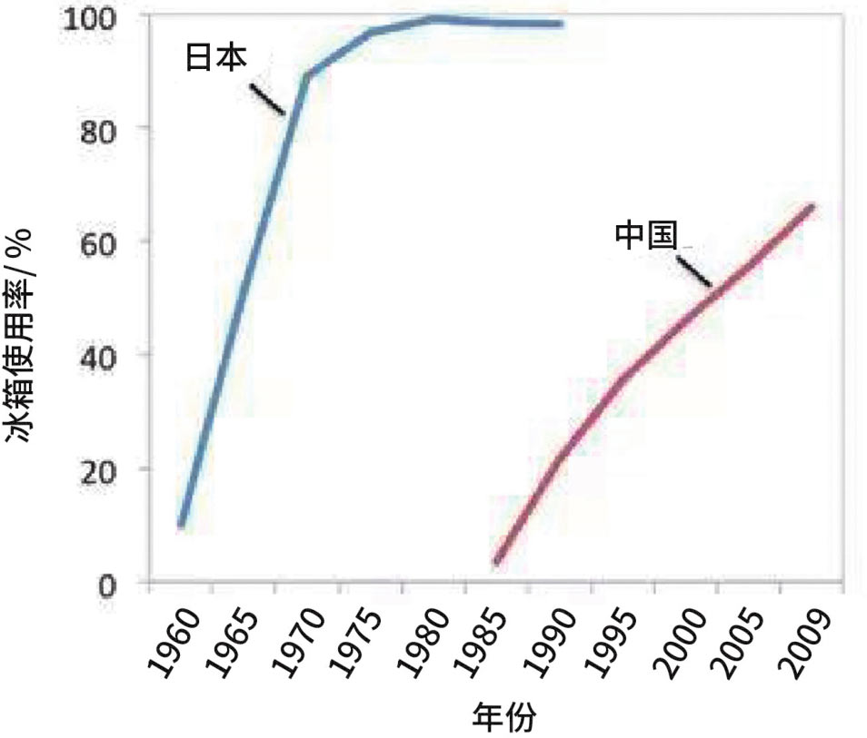 那中国是什么情况?根据《中国统计年鉴》(2011年)的数据,中国城镇每百户拥有电冰箱在2000年才有80.1台,到2010年达到96.6台,基本饱和,但是在农村还有很大的缺口。