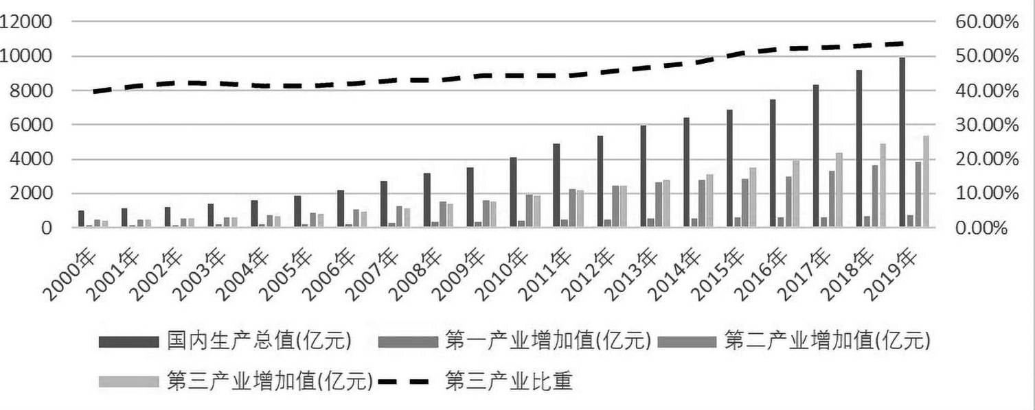根据全球发达国家的经济发展史,各国的经济发展均呈现出程度不一的服务化趋势。在经济发展初期,劳动力大都聚集于第一产业,随着经济的发展和城市化率的提升,在第一产业的支撑下第二产业开始得到发展,经济发展由农业主导转向工业主导,又由轻工业转向重工业继而转向高附加值工业导向,劳动力随之开始转向第二产业。随着科技水平、经济水平和居民生活水平的进一步提升,服务业开始逐渐占据一国经济发展的主导地位。目前,发达国家产业结构普遍存在两个“70%”现象,也即服务业增加值占GDP的70%以上,生产性服务业占服务业的70%以上,例如美国、法国、德国和日本三个发达国家第三产业占比分别为80.5%、75.4%、69.59%和71.2%。其中,在1970—2019年,美国服务业增加值占GDP的比重从61.22%攀升至81%,第二产业工业增加值占GDP比重则由35.24%下降至18.11%,而2019年的第一产业增加值占GDP比重仅为0.89%。作为制造业强国的德国和日本,其产业结构也经历了类似的演变。发达国家的经济结构演变史在很大程度上表明了全球经济发展具有一定的规律性,这不仅为我国的经济发展提供了有价值的参考,更是说明我国在提升服务型经济方面具有较大的空间。每个发达国家经济结构演变的成功经验均为我国的经济发展方向提供了多种可选途径,那么,到底何种途径才最适合我国国情,才能顺利实现我国经济结构的升级转型呢?显然,加快我国服务经济的发展无疑是其中较为有效且可行的途径之一。