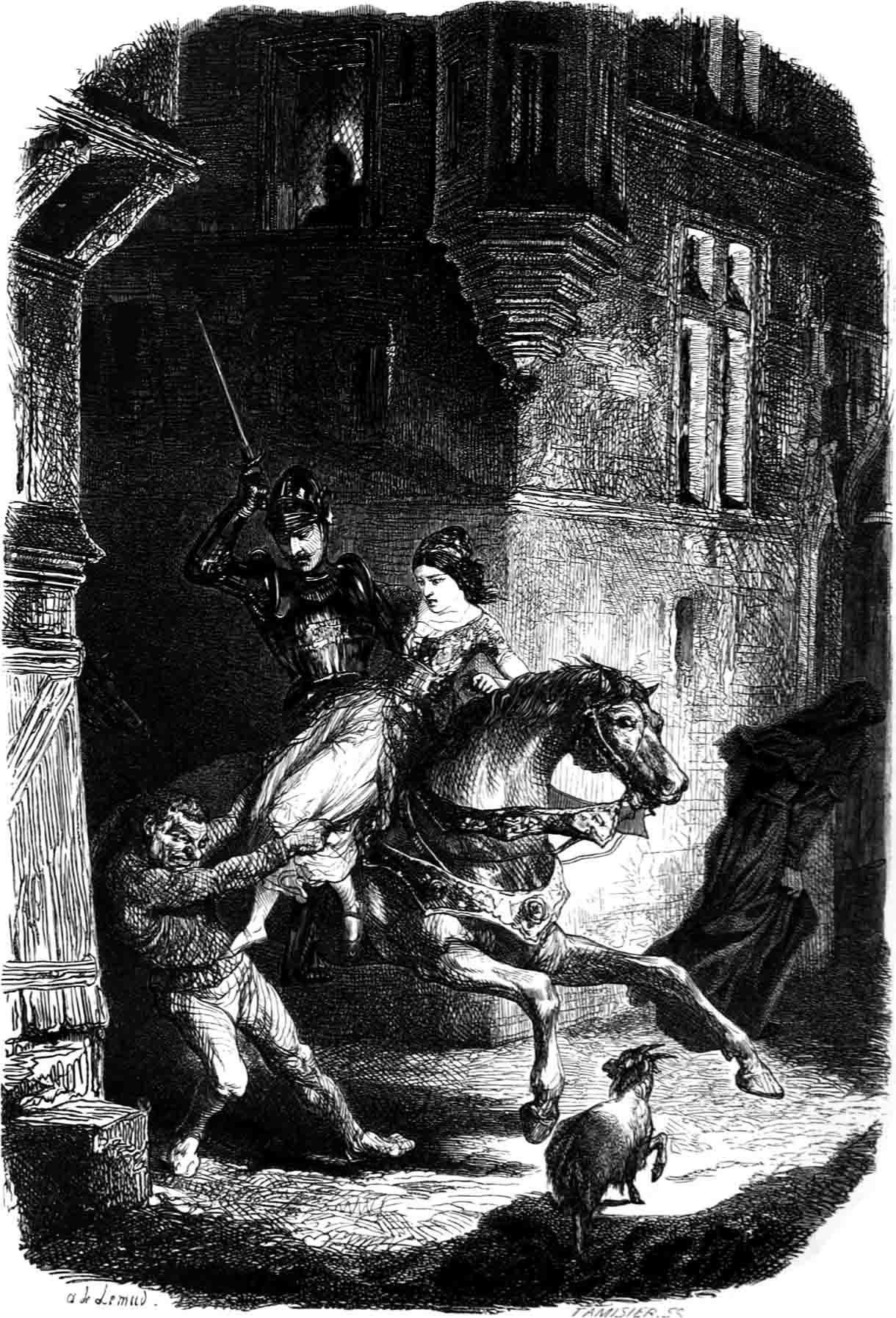 卡西莫多吓蒙了。弓手队长从他的怀里夺过姑娘,放到自己的马鞍上。等可怕的驼背回过神来,扑上去要把猎物抢回时,紧跟在队长身后的十四五名弓手举着长剑出现了。这是御前侍卫队的一支分队,奉御前大法官罗贝·代图特维尔大人之命,在进行夜间巡逻。