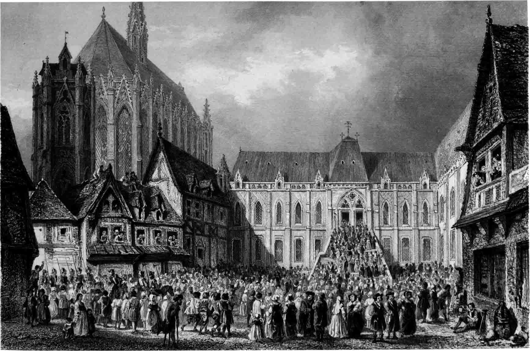 拥到司法宫前后左右各条街道的人尤其多,因为他们知道,两天前来到的弗兰德尔使臣们想去司法宫大厅看圣迹剧,同时观看挑选狂人教皇。