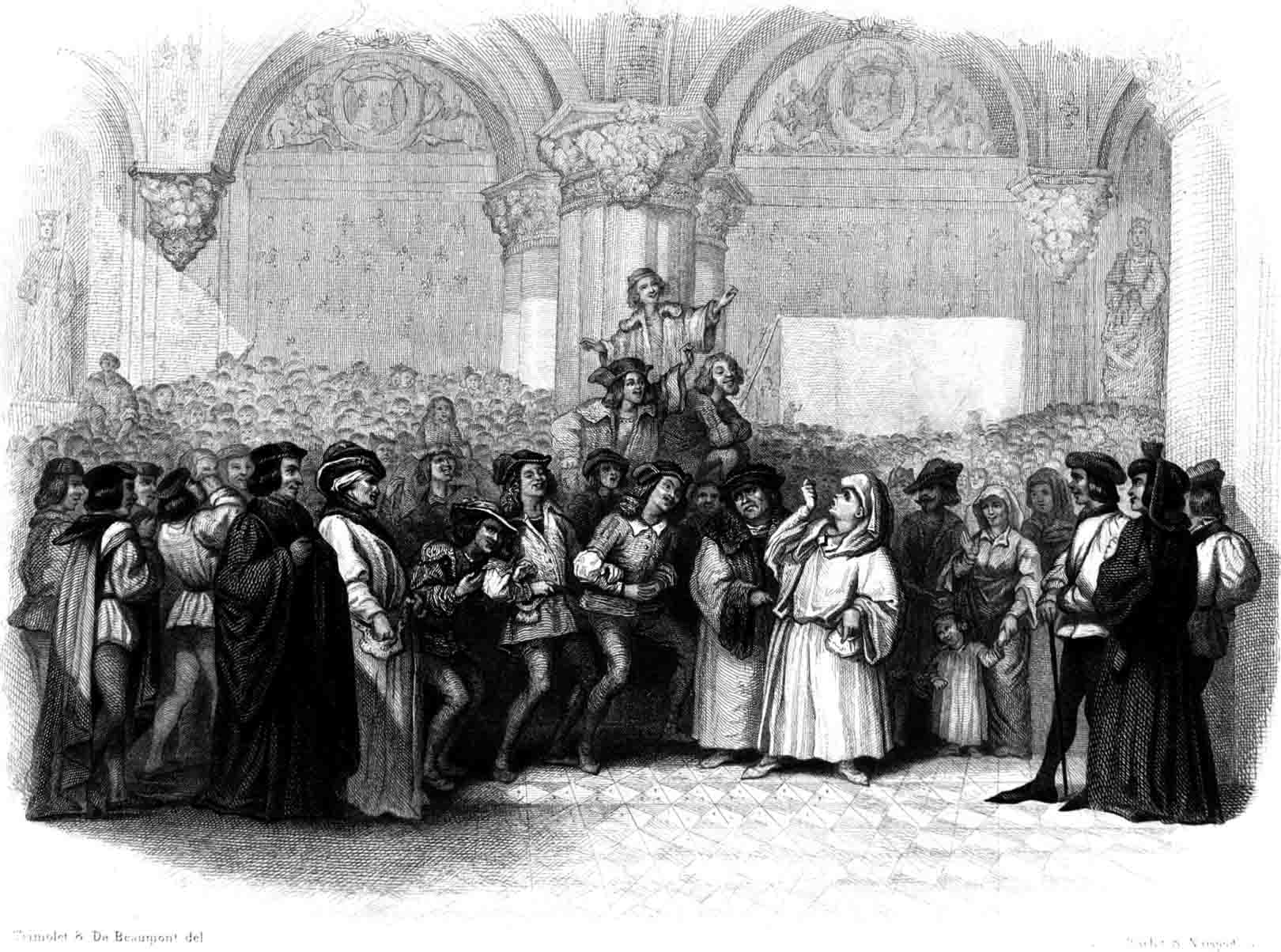 按照惯例,圣迹剧一定要在那张大理石桌上演出。因此,一大早桌子就布置好了。华丽的大理石桌面已被法院书记员们的鞋跟划得伤痕累累,现在又用木板搭起了一个相当高的笼子,顶上那层木板充当舞台,整个大厅都看得见,笼身用帷幔围起来,到时用作剧中人物的更衣室。从更衣室上舞台,中间有一架梯子,梯子不太雅观地露在外面,演员们要爬着陡峭的梯子上场下场,没有一个角色,没有一段曲折的剧情,没有一个惊人的突变,不是经过事先安排爬梯子上场的。戏剧艺术和舞台布景也有令人钦佩的天真可爱的童年。