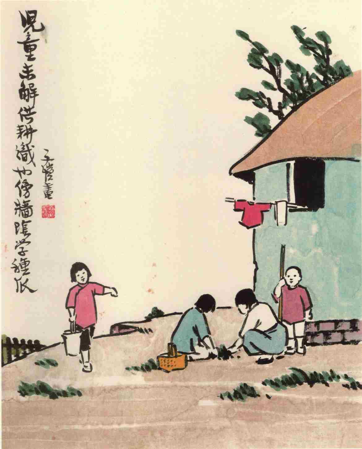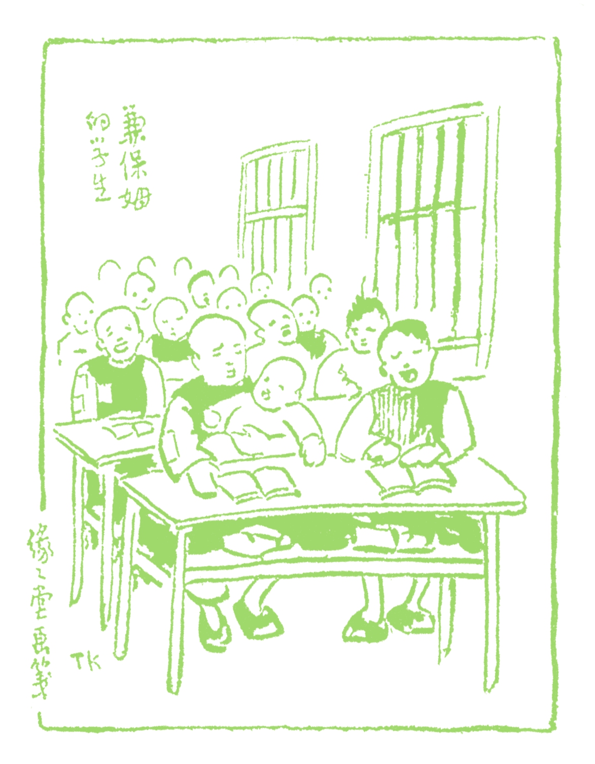 发完习字簿,最后一件事是“对课”。先生昨天在你的“课簿”上写两个或三个字,你拿回家去,对他两个或三个字,第二天早上交在先生桌上。此时先生逐一翻开来看,对得好的,圈一圈;对得不好的,他替你改一改。然后再出一个新课,让你拿回去对好了,明天来交卷。什么叫对课呢?譬如先生的“红花”两字,你对“绿叶”;先生出“春风”,你对“秋雨”;先生出“明月夜”,你对“艳阳天”……对课要讲词性,要讲平仄(什么叫作词性和平仄,说来话多,我暂时不讲了)。这算是私塾里最有兴味的一课。然而对得太坏,也不免挨打手心。对过课之后,先生喊一声:“去!”学生就打好书包,向孔夫子牌位拜三拜,再向先生拜一拜,一缕烟跑出学堂去了。这时候个个学生很开心,一路上手挽着手,跳跳蹦蹦,乱叫乱嚷,欢天喜地地回家去,犹如牢狱里释放的犯人一般。