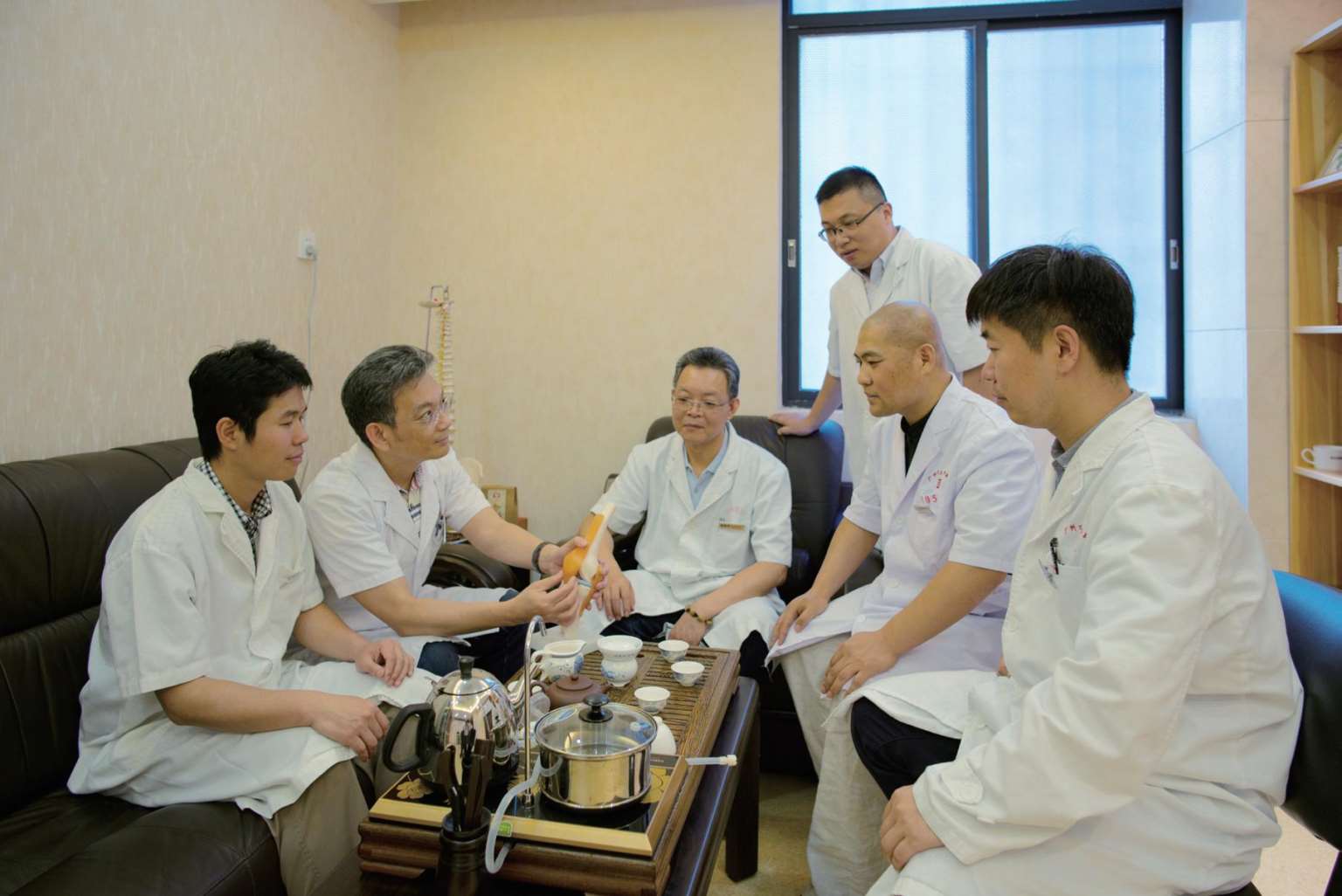 图6 黄氏理伤手法学术传承讨论(由左至右依次为:朱伟亮、黄崇博院长、黄崇侠主任、付涛、胡凤军、郑旭哲)