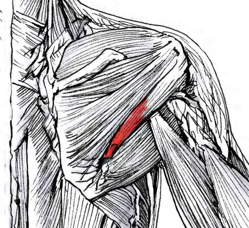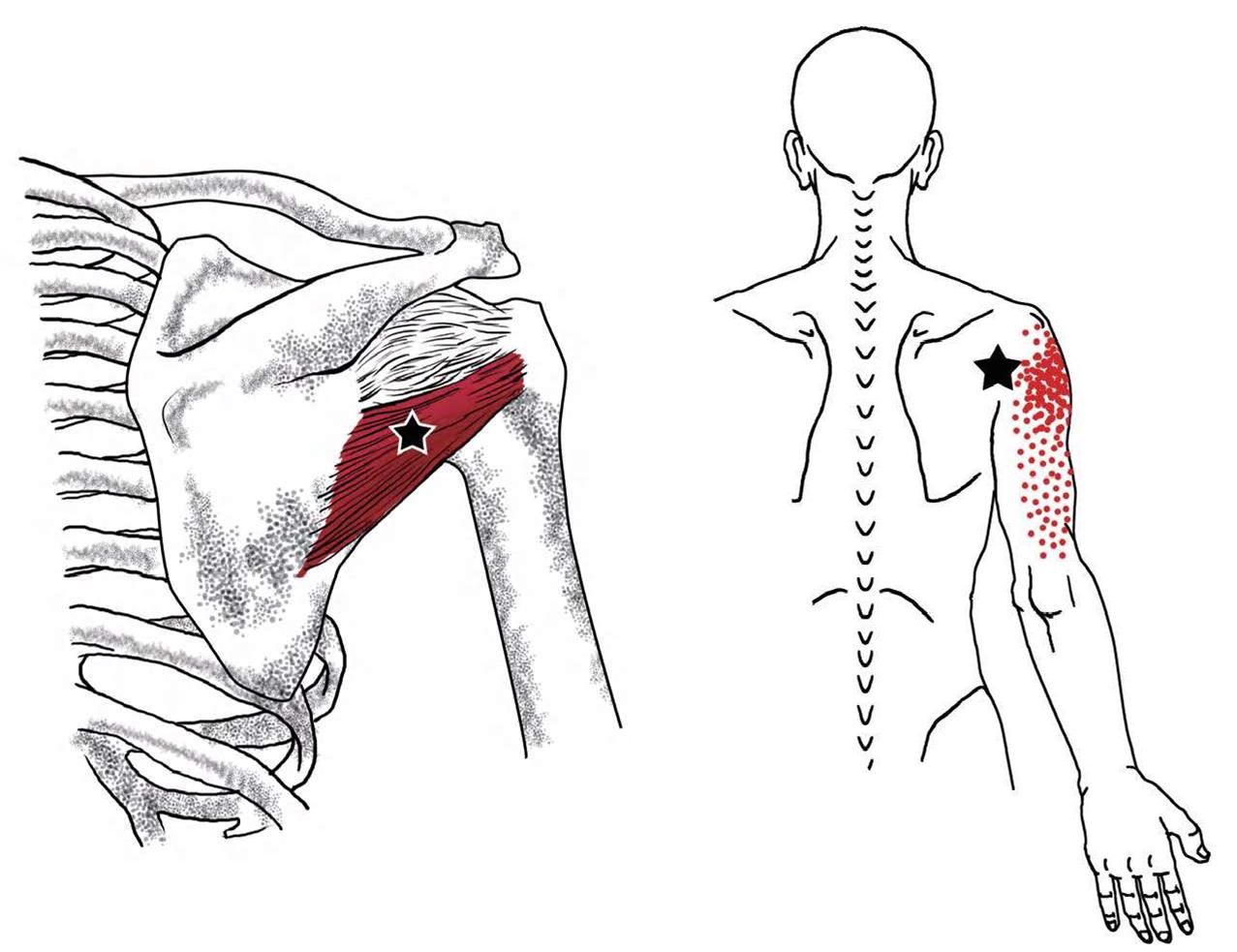 图2-1-11 小圆肌解剖位置及体表反应点示意图