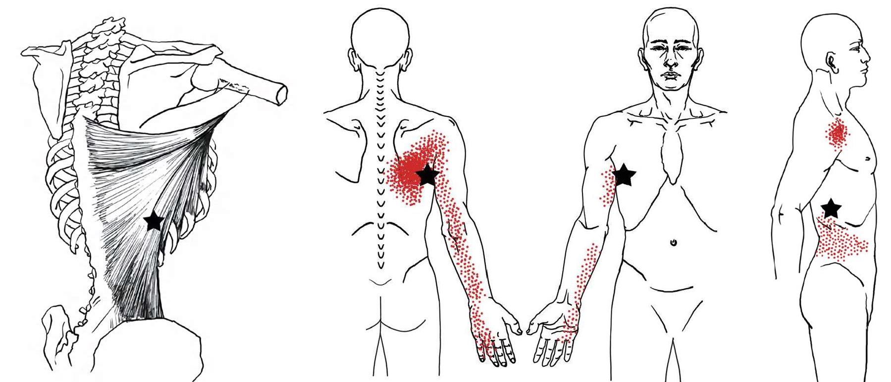 图2-1-14 背阔肌解剖位置及体表反应点示意图