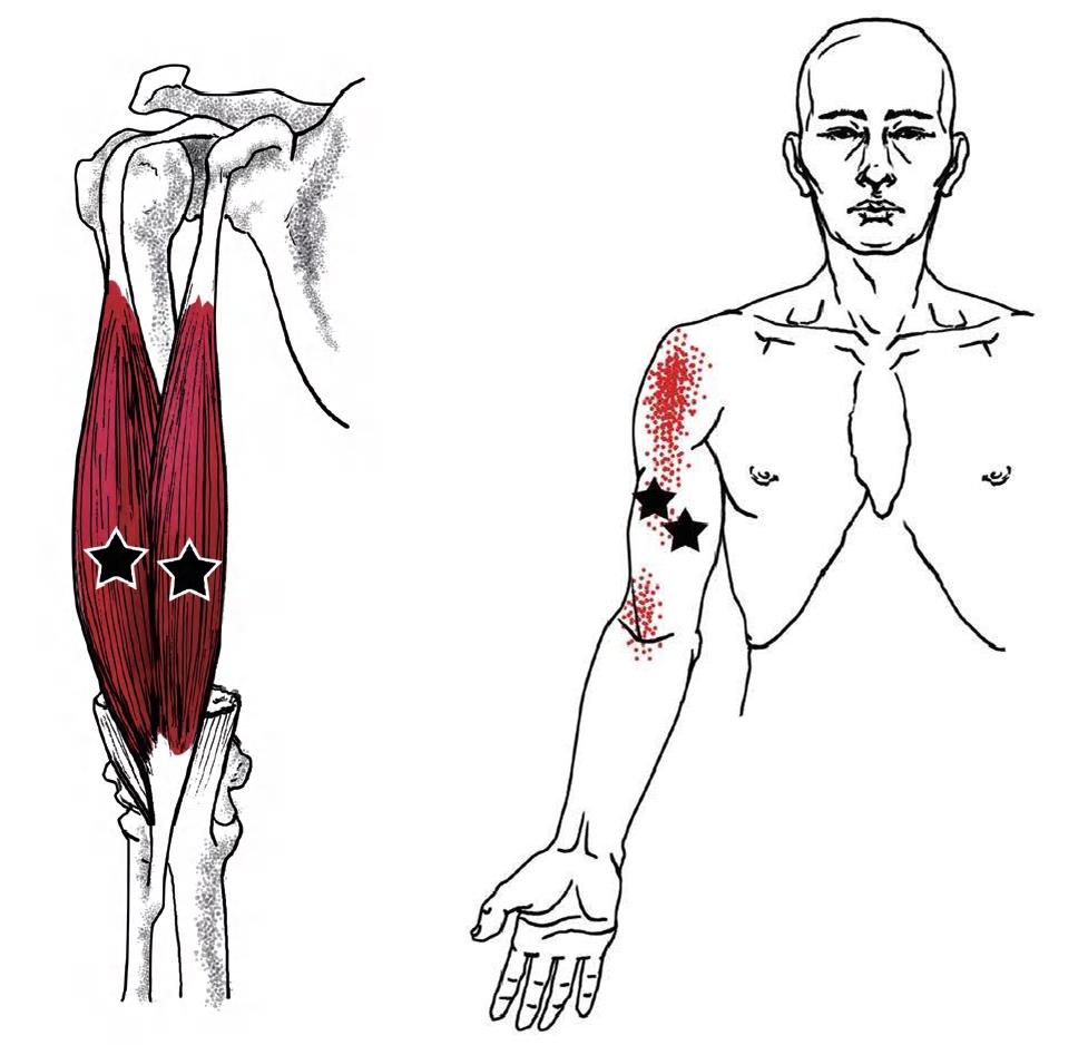 (2)慢性劳损:由于肘关节或上肢损伤后手臂需要长期固定不动导致,或因肌肉长度过度缩短会导致激痛点活化。