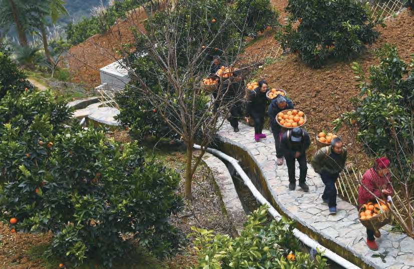 毛相林和下庄村村民在背运刚采摘的柑橘