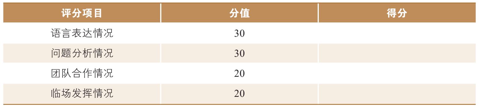 (4)讨论结束后,每个小组推选一名发言代表上台发言,发言时长5分钟以内。其他小组就该小组的表现进行打分。教师对每一位发言同学的发言进行引导性点评,对质量较高的小组予以表扬。