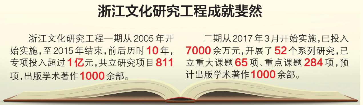 作为浙江在文化领域“秉持浙江精神,干在实处、走在前列、勇立潮头”的重要标志,浙江文化研究工程深入实施的过程,也是全省上下践行文化自觉、彰显文化自信的过程。16年来,浙江历届省委坚持一张蓝图绘到底,一任接着一任干,投入资金过亿元,立项千余个,动员数千名省内外学者积极参与,出版学术专著千余部。2015年,一期工程完结;2017年开始的二期工程的第六批课题已经立项;三期工程即将进入部署阶段。
