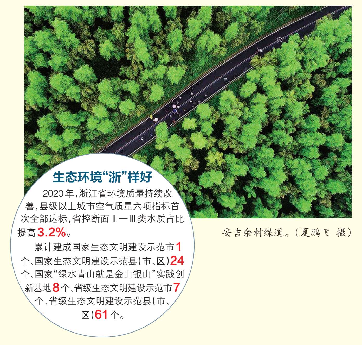 数据显示,多年来,安吉地表水环境功能区、出境交界断面水质达标率保持在100%,空气优良率、植被覆盖率分别在80%、75%以上,绿水青山正融入每个人的生活。